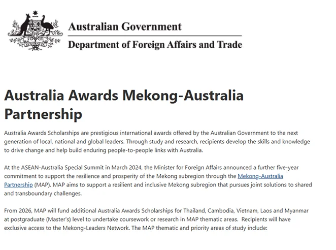 The Australian Government, through the Mekong-Australia Partnership (MAP), is offering prestigious Australia Awards Scholarships for citizens of the Mekong subregion to undertake Master’s level study in Australia starting in 2026.